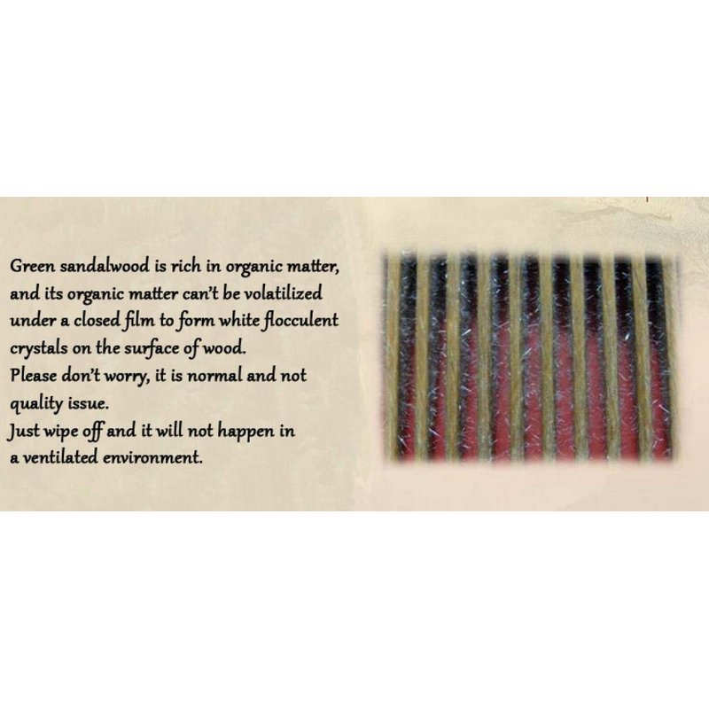 1. Green sandalwood is rich in organic matter, and its organic matter can't be volatilized under a closed film to form white flocculent crystals on the surface of wood. Please don’t worry, it is normal and not quality issue. Just wipe off and this will not happen in a ventilated environment.