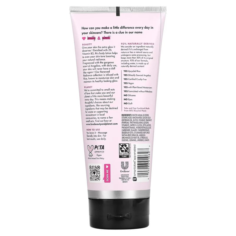 Give your skin the extra glow it deserves ! Enriched with 2% Vitamin B3, this body lotion helps to even your skin tone boosting your natural radiance. Fragranced with the gorgeous scent of Angelica, with daily use, your skin will never have a dull day again ! Our Renewed Radiance collection is infused with Rice, known to moisturize skin and maintain its healthy-looking glow. We're committed to small acts of love that make you and our planet a little more beautiful every day. This means making thoughtful choices about our ingredients, like sourcing ingredients that may be destined for waste or supporting reinvestment in local communities, to name a few small acts. We consider an ingredient naturally derived if it's unchanged from nature or has a natural source and undergone some processing, but keeps more than 50% of its original structure. 93% of our formula, including water, is made up of naturally derived content!