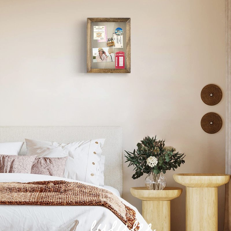 - Memory box - Inside the frame is a linen cloth with pins so you can arrange a personalized collage with photos, cards, concert tickets, medals, dried flower and handicrafts, etc. Prefect way to share your most cherished moments and memorabilia.