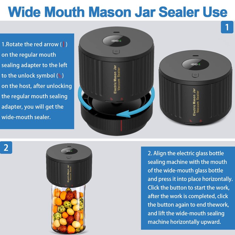- 【Portable vacuum sealer】Don't have a vacuum sealer? Don't worry!!! We offer you an electric Mason jar sealer that you can use to extract the air from your Mason jars. The sealer is too big to carry with you when you travel or have a picnic? You can also use this electric sealer instead of it.