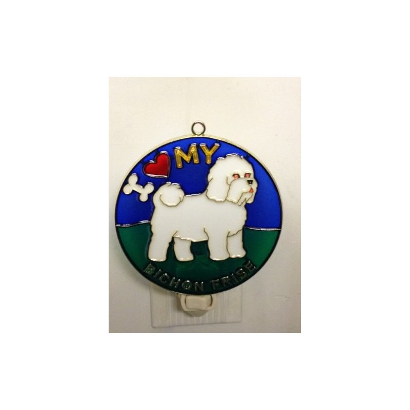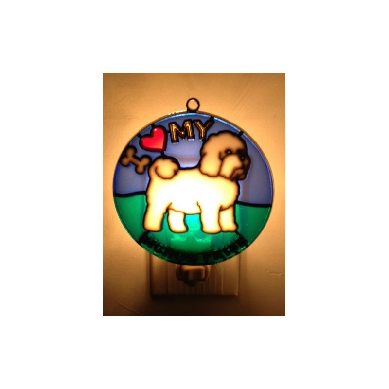 4-1/2 " round brass plated metal frame & epoxy resin fill design . Sturdy plug . Comes with standard size light bulb. Makes a great gift for your Bichon lover