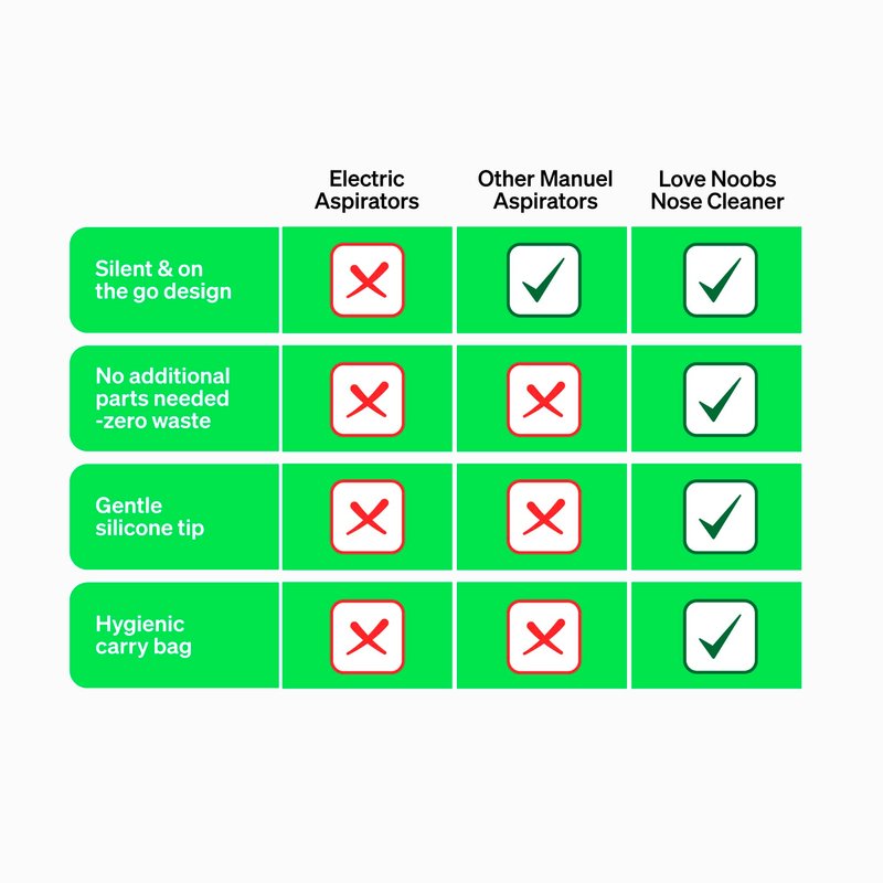 - NEWBORN BABY NASAL ASPIRATOR: Gentle and suitable for use from Day 1. Soft and non-invasive rounded tip prevents the Nose Cleaner from being inserted too far into your baby’s nostril. Love Noobs Baby Booger Sucker is the perfect tool to clear mucus build-up in tiny nostrils that cannot yet be blown for themselves. It is well accompanied with saline nasal sprays for babies.