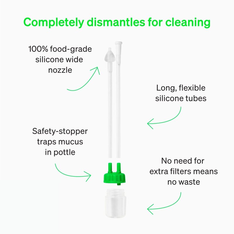 - REUSABLE BABY NOSE SUCKER: Our baby booger sucker is made up of only four parts and no additional filters or accessories are required. There is no waste and no need to re-order more. Do not waste money on additional nasal bulbs or hygiene filters.