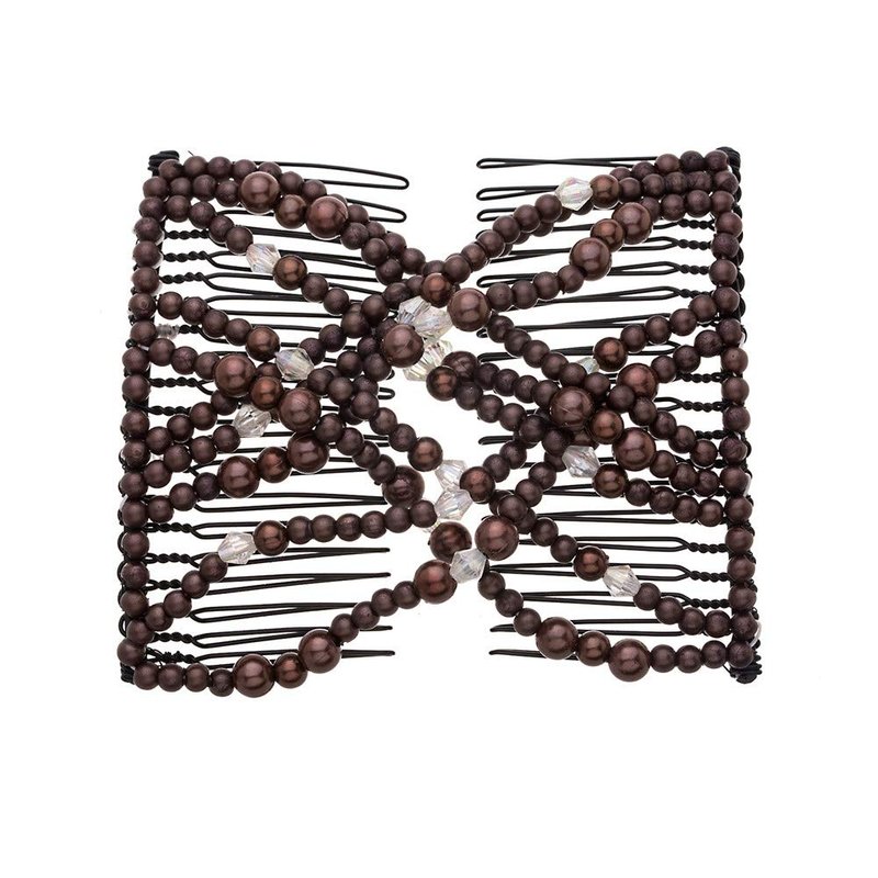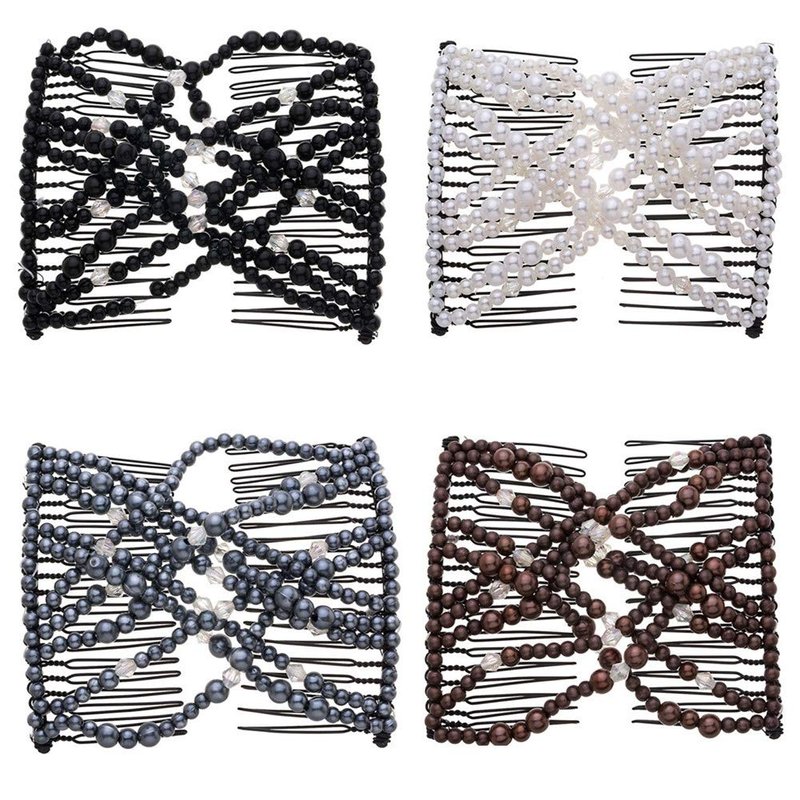 LOVEF 4Pcs Double Magic Slide Metal Comb Clip Hairpins Vintage Pearl Bead Stretchy Hair Combs for Women Ladies Hair Accessories Gift (Coffee)