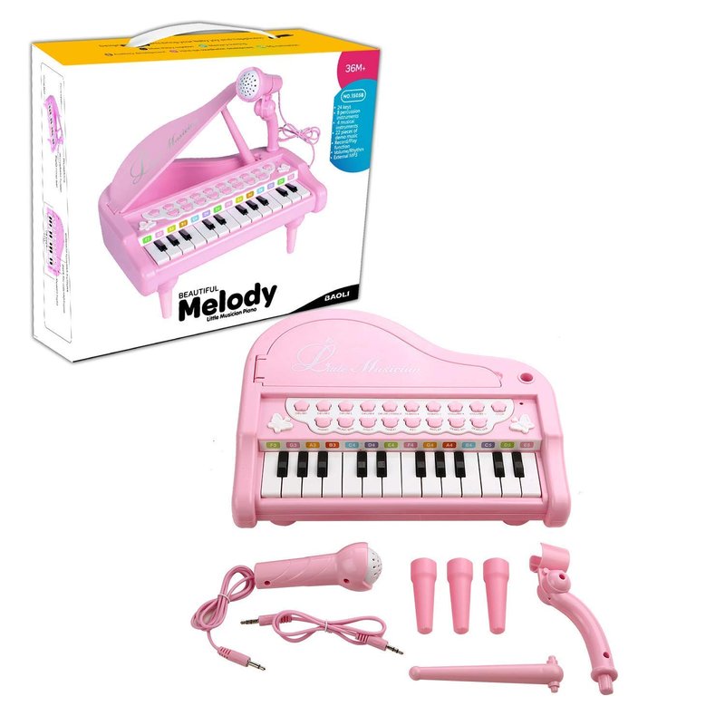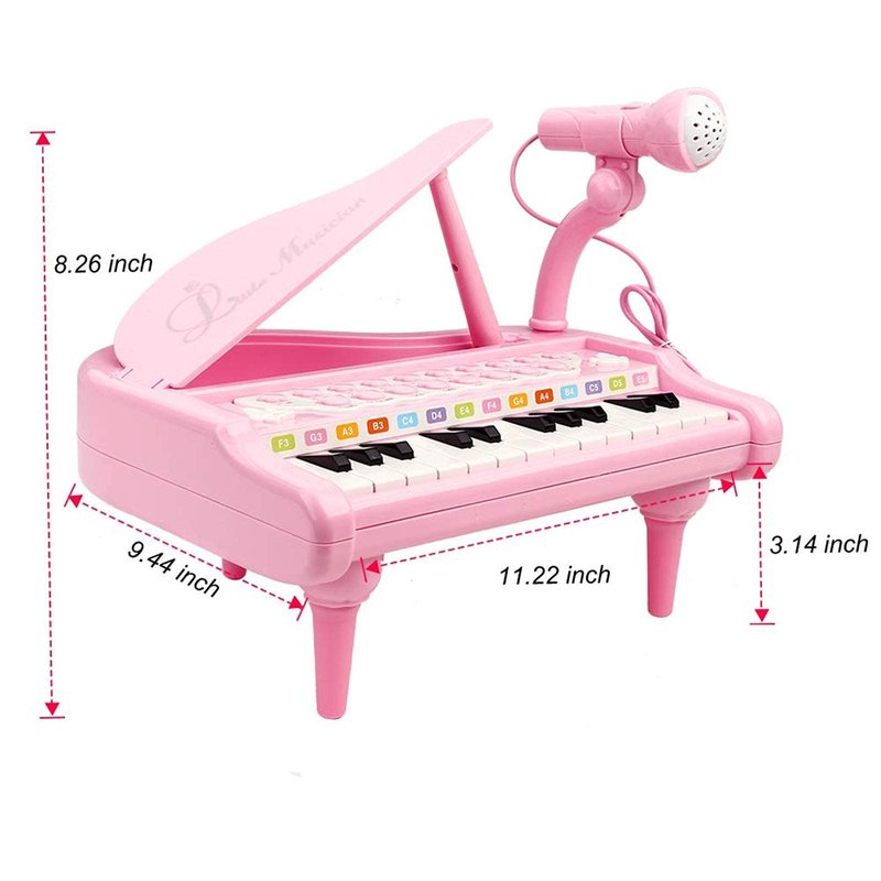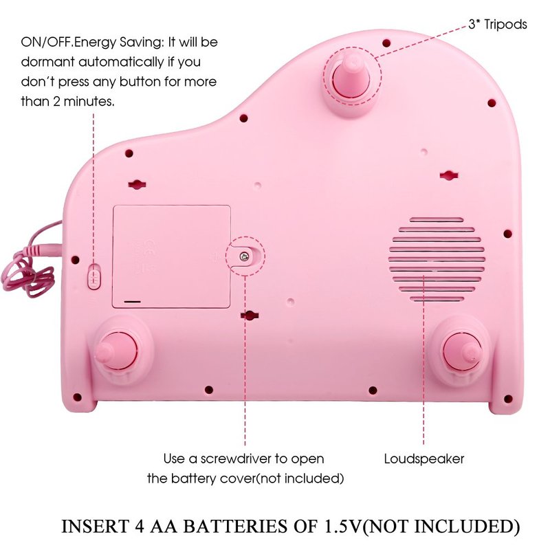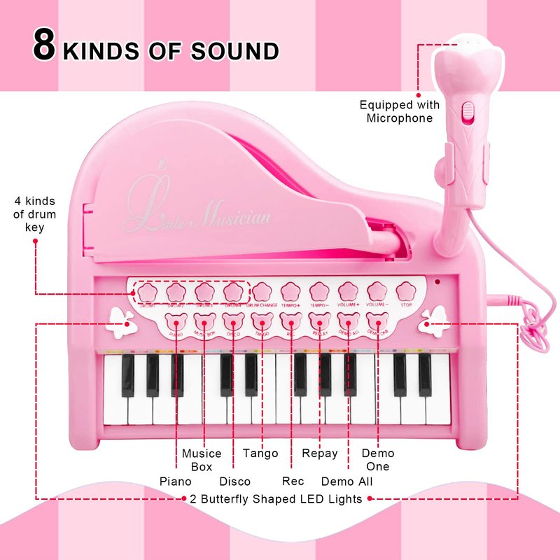 - Multi-Function Kids Piano Toy: 24-key music piano with 4 instrument keys (piano, music box, disco, tango), 8 percussion sound effects (4 additional drum sound effects) and 22 demo songs, compatible with microphone and mobile phone, MP3 music external device. powered by 4 1.5 V AA batteries (not included).Children can play piano anytime, anywhere.