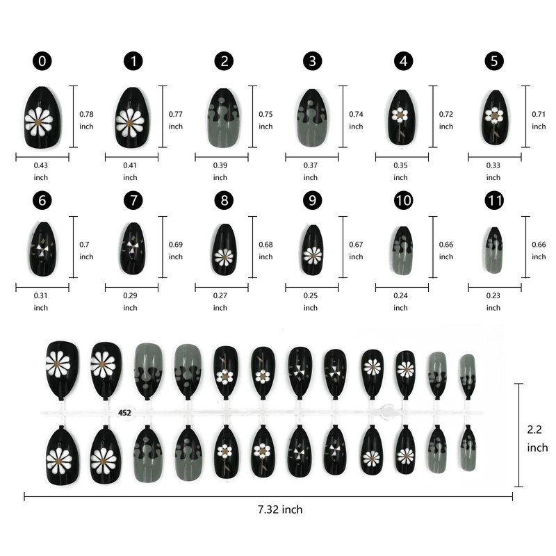 - Cute medium length almond fake nails with design featured with 10 different sizes, which can fit for most size nail beds ( wide or narrow ). Stylish image design, suitable for any occasions and events, perfectly go with every style outfit, makeup and skin tone.