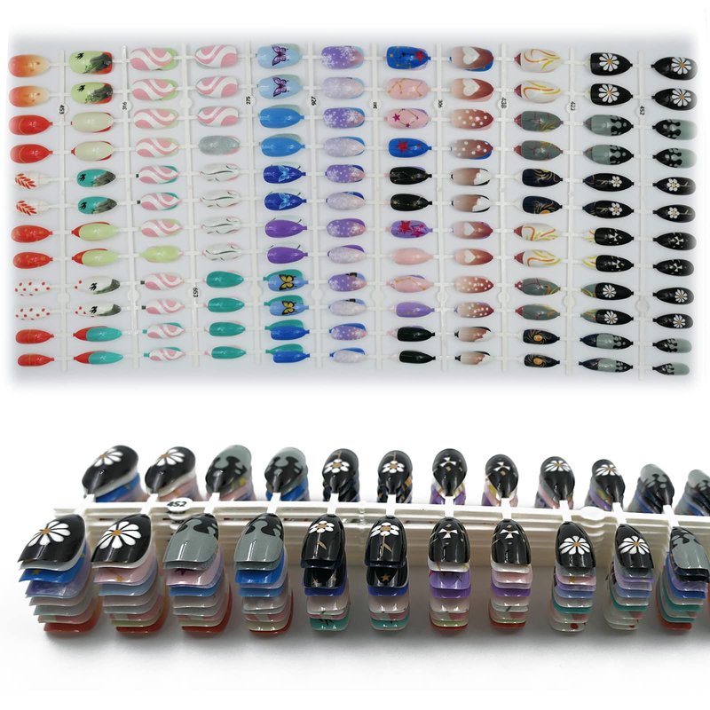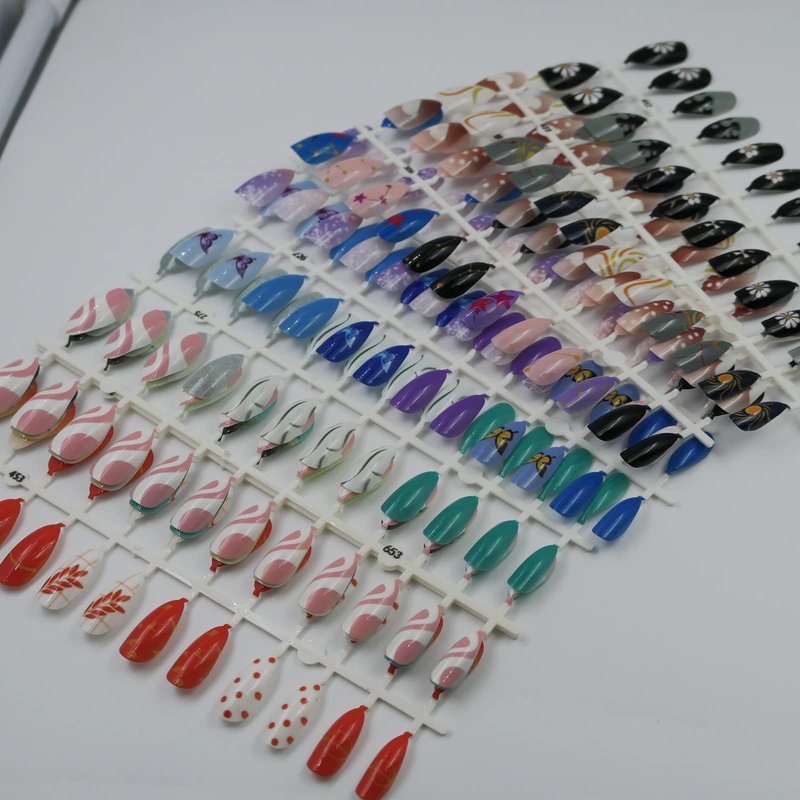 - Press on nails can applied with nail glue or nail adhesive tabs easily,don't need extra nail polish or decorations. Pre painted with various cute pattern, make your finger nails looks trendy, lovely and impressive. For long lasting result, we recommend use strong nail glue to apply these almond nails tips, which can last 1-2 weeks.