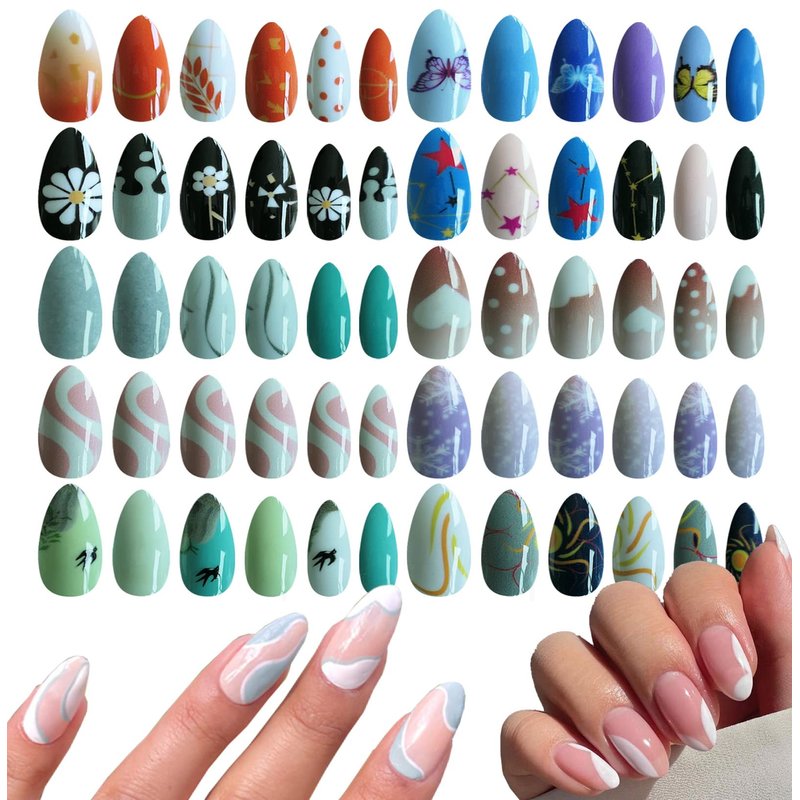 - Reusable medium almond presson on nails are shine and glossy, look like uv gel nails, there mixed with 10 different style designs, there are nude heart almond nails, stars press on nails, black white design nails,blue butterfly press on nails,snowflakes christmas press on nails,swirl press on nails,mint green bird press on nails,black daisy flower nails,marble fake nails,and orange autumn leaf press on nails.