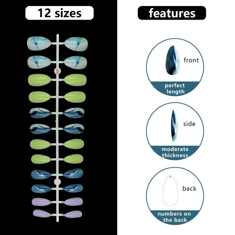 - Cute medium length almond fake nails with design featured with 10 different sizes, which can fit for most size nail beds ( wide or narrow ). Stylish image design, suitable for any occasions and events, perfectly go with every style outfit, makeup and skin tone.