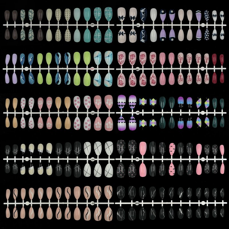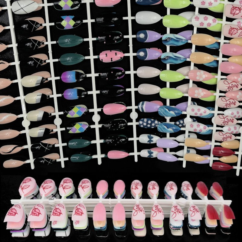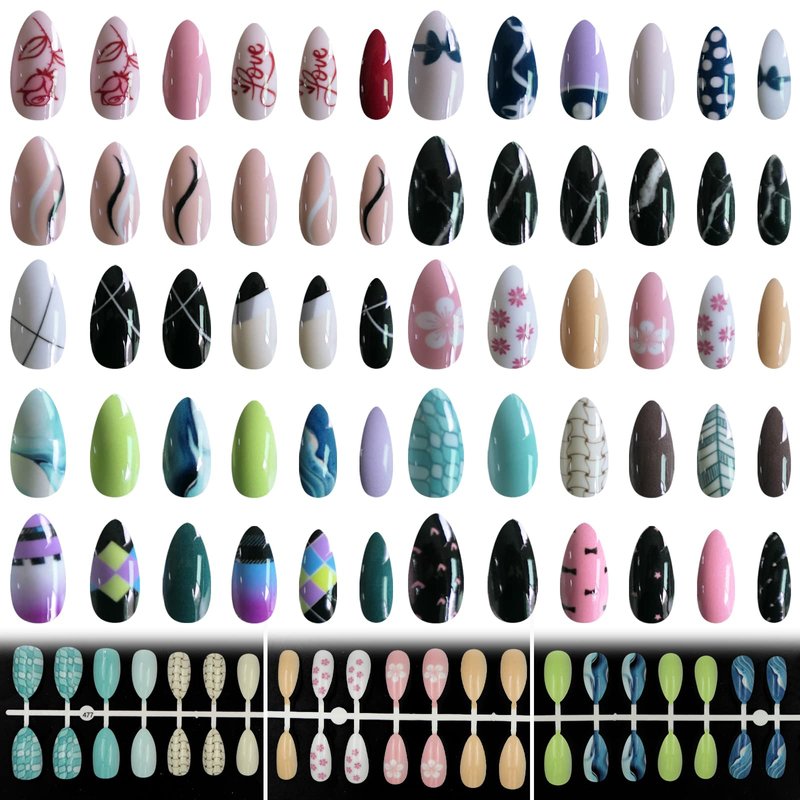 - Press on nails can applied with nail glue or nail adhesive tabs easily,don't need extra nail polish or decorations. Pre painted with various cute pattern, make your finger nails looks trendy, lovely and impressive. For long lasting result, we recommend use strong nail glue to apply these almond nails tips, which can last 1-2 weeks.