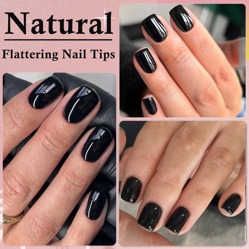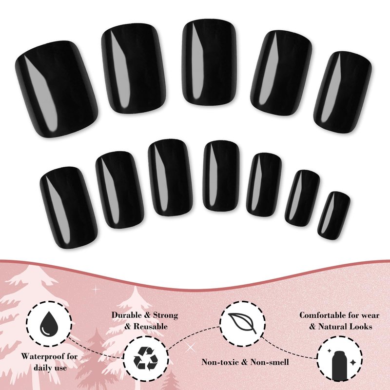 - Multiple Uses: Square press ons designed with short elegant square shape, At the tip, square nails are squared off rather than rounded, giving black nails a modern and edgy appearance. Short square presson on nails can wear with nail glue or nail sticker directly. Short length square nail won’t affect daily life and work, you can wear black glue on nails to type, write, swim, do housework, paint, work, sturdy, play with pet etc. Short black nails suitable for any seasons and occasion.