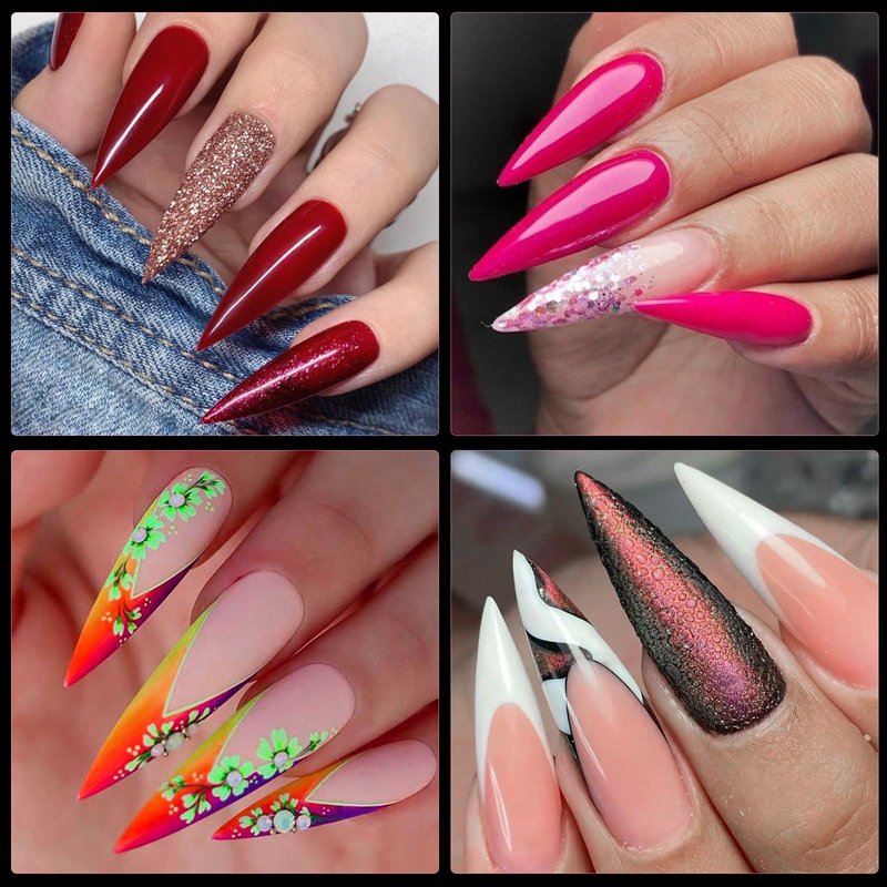 - Full cover nail tips xl stiletto nails can paint and apply different color nail polish, UV gel and building gel to strengthen nail, decorating with nail glitter flakes, dip powder, charms, rhinestones, jewelry, sticker decals and other nail supplies, are easy to create your luxury stiletto press on nails