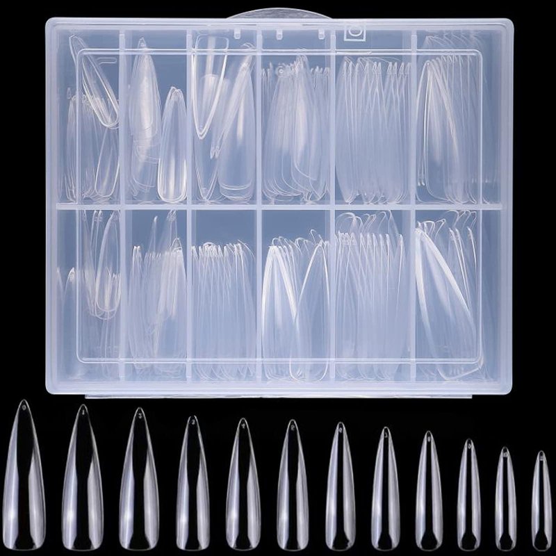 - Clear nail tips for acrylic nails professional includes 240pc clear extra long pointy stiletto fake nails, 12 different sizes xl long stiletto nail art tips, full cover designs, 20pc each size, total 240pc xl stiletto acrylic nail tips in a plastic case, ready for halloween or party nail gift giving.