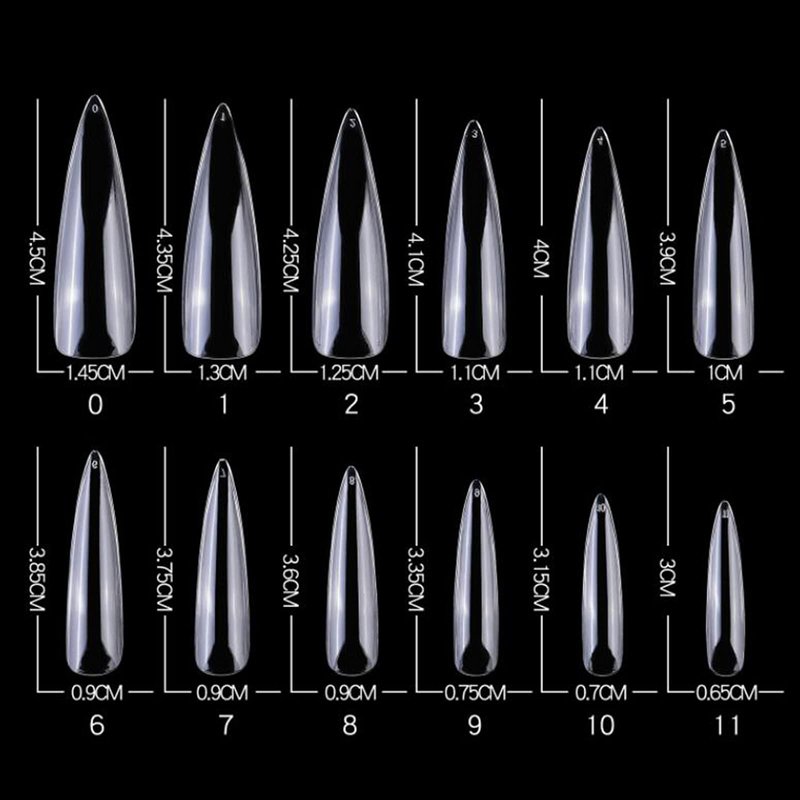 - Clear stiletto press on nails featured with 12 different sizes, pre numbered from 0-11, so these halloween stiletto nails are convenient to choose the most suitable size xl nail tips to fit your every finger nails. No matter you have large/wide nail beds or narrow/small nail beds.