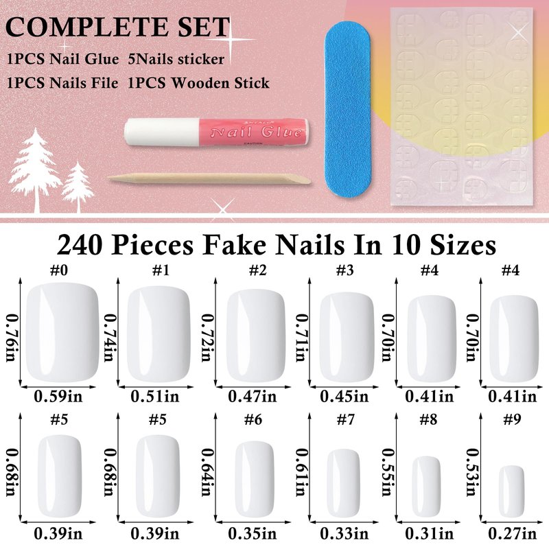 - 12 Sizes Square Nails Press ons Fit for Most Fingers: White press on nails short square featured wit 12 different sizes individually numbered 0 to 11 for different nails, Short fake nails designed with 20pc square nail tips per sizes, total 240pc fake nails with glue for easy applications. Full glue on nails allows you you easily find the best size nails tips for every fingers. 12 Sizes white press on nails can fit for wide/small nail bed and large or petite nail.