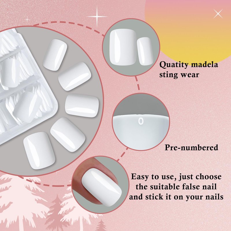 - Short Fake Nails Square Shape:White artificial nails short length with nail tabs have straight sides that extend from the nail bed to the tip, creating a clean and angular look. The rounded and smooth shape of square nails naturally exudes a simple and elegant temperament. Square press on acrylic nails look natural on fingers. The visual effect of square nails glue on fake fingernails makes the fingers appear longer and more slender. Short glue on nails suitable for women and teenage girls nail design.