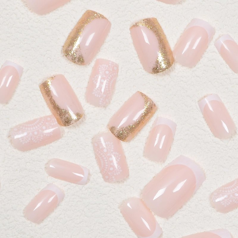 - Full cover medium square nails press ons designed with white french tips, gold glitter powder and white mandala print on nude pink false nails make a pretty trendy and natural nude press on nail set for a women and teen girls.