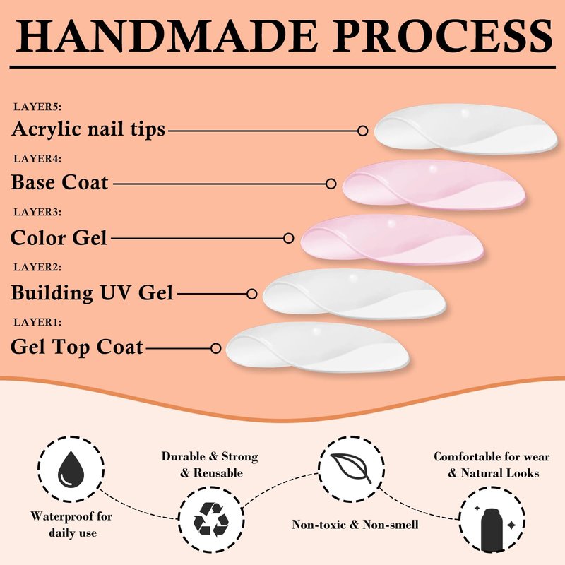 Acrylic nail press ons nails are durable and reuse, won't hurt nail bed.