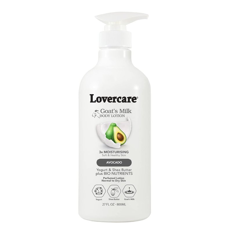 - Lovercare Goat Milk Body Lotion for Dry Skin 27.05 oz Avocado (800ml) is a nutrient-rich body lotion that soothes dry and itchy skin while providing deep moisturization. Enriched with avocado, shea butter, yogurt, and goat milk, this body lotion provides 3X moisturizing power to keep your skin healthy and hydrated every day. Avocado is known for its great variety of skin care benefits. It helps relieve dry and itchy skin and deeply moisturizes the skin, keeping it plump and decreasing the effects of aging. Avocado contains a high amount of strong skin agents such as vitamins A, C, E & K, proteins, unsaturated fats, and omega-3 fatty acids to keep your skin healthy and hydrated. Shea butter is an excellent skin conditioner with added benefits of Vitamins F & E. It is non-irritant to skin and helps soothe skin with frequent use. Yogurt is rich in protein and helps to moisturize and smooth the skin. Goat milk is naturally enriched with high amounts of protein, fat, iron, and lots of vitamins. It has a pH nearly the same as human skin, allowing our product to easily be absorbed into human skin with no greasy residue, keeping you moisturized and nourished. Lovercare Goat Milk Body Lotion is cruelty-free, gluten-free, and sulfate-free, making it friendly for everyone. It is suitable for extra-sensitive skin