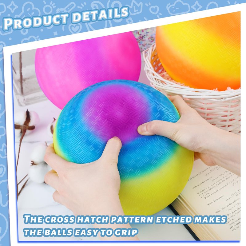 - Package Include: The ball set includes 1PC rainbow playground ball and 1PC air pump (Placed inside of the handle of pump ). The ball has an 8.5inch diameter (after inflating), featuring textured no-slip grip, bright and vibrant.