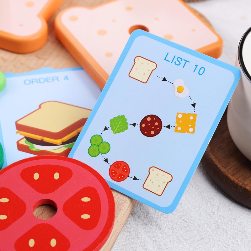 - Entertaining Learning Toys - Featuring illustrations of completed sandwiches and step-by-step picture instructions, our cards allow you to take on the role of customers. By selecting cards, children can follow the menu instructions to assemble hamburgers.