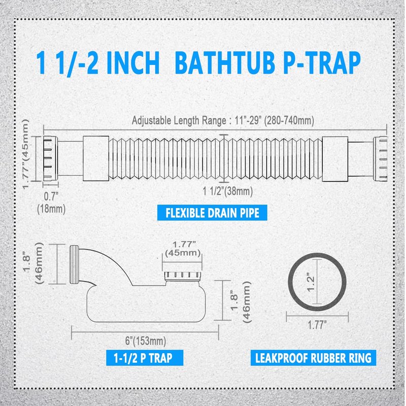 - ✔ The trap's flex pipe can be stretched in lengths of 11"-29". It can be bent and stretched at will in the narrow space of the freestanding bathtub.