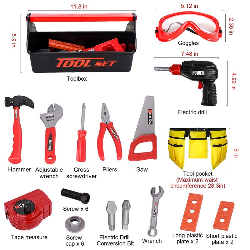 - CONVENIENT CARRY BOX FIT 27PCS OF TOY TOOL FOR EASY STORAGE: LOYO toy construction tools come complete build & play tool set includes everything need in a tool box just Like Dads’. Toy tool set including battery-powered toy drill, realistic-looking hammer toy, screwdriver, blinkers, ruler, toolbox, tool belt, wrench, screw and 4 wood pieces for practice etc., everything is fully functional and realistic.