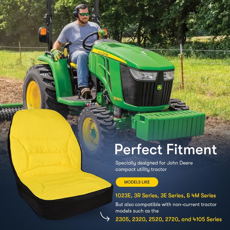 - Great Compatibility: The LP95233 large seat cover is specially designed for John Deere compact utility tractors with seat backs up to 18" WITHOUT armrests. Including models such as the 1023E, 3R Series, 3E Series, and 4M Series. But also compatible with non-current tractor models such as the 2305, 2320, 2520, 2720, and 4105 series. Part Number: LP95233.