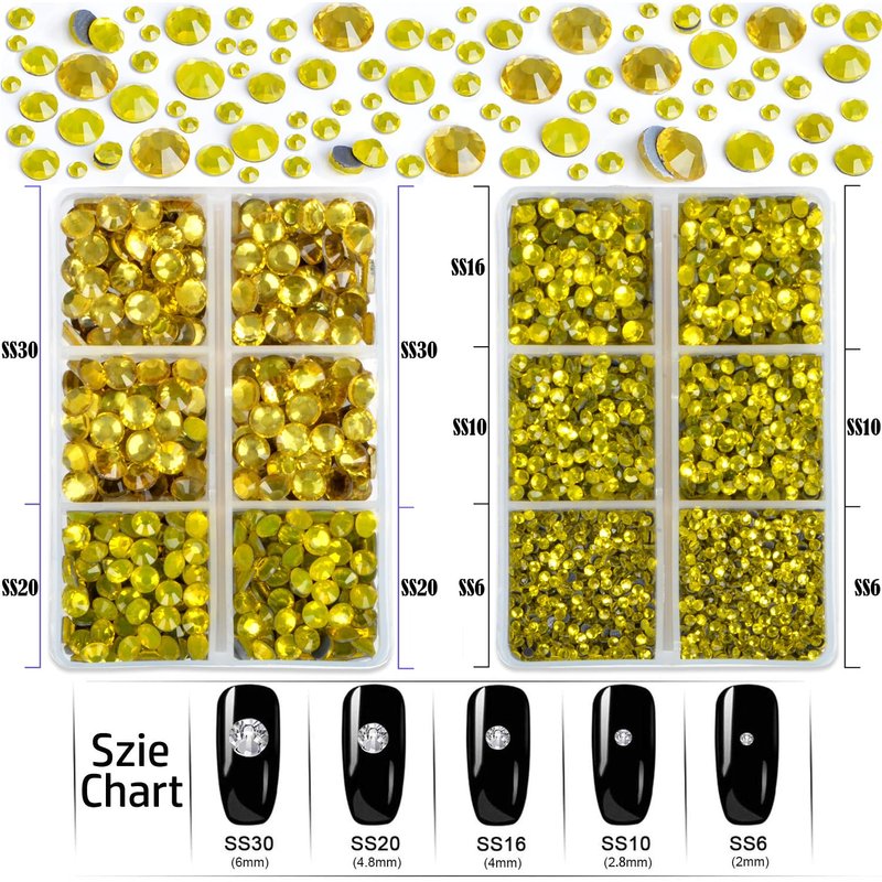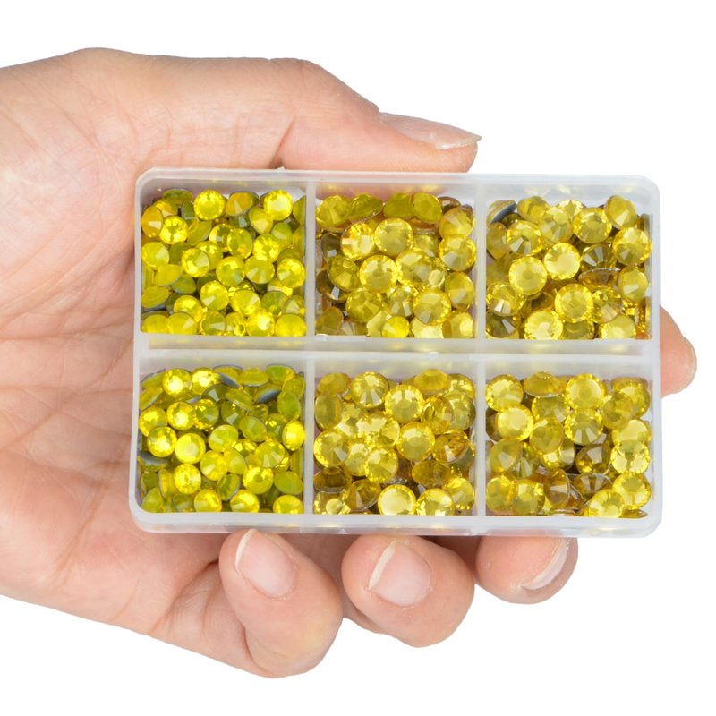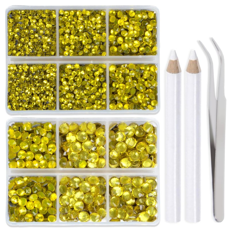 - Package includes: Lemon yellow 6400pcs flatback glass glittering hotfix rhinestones bulk in 5 sizes, with good quality tweezers and picker wax pencil.