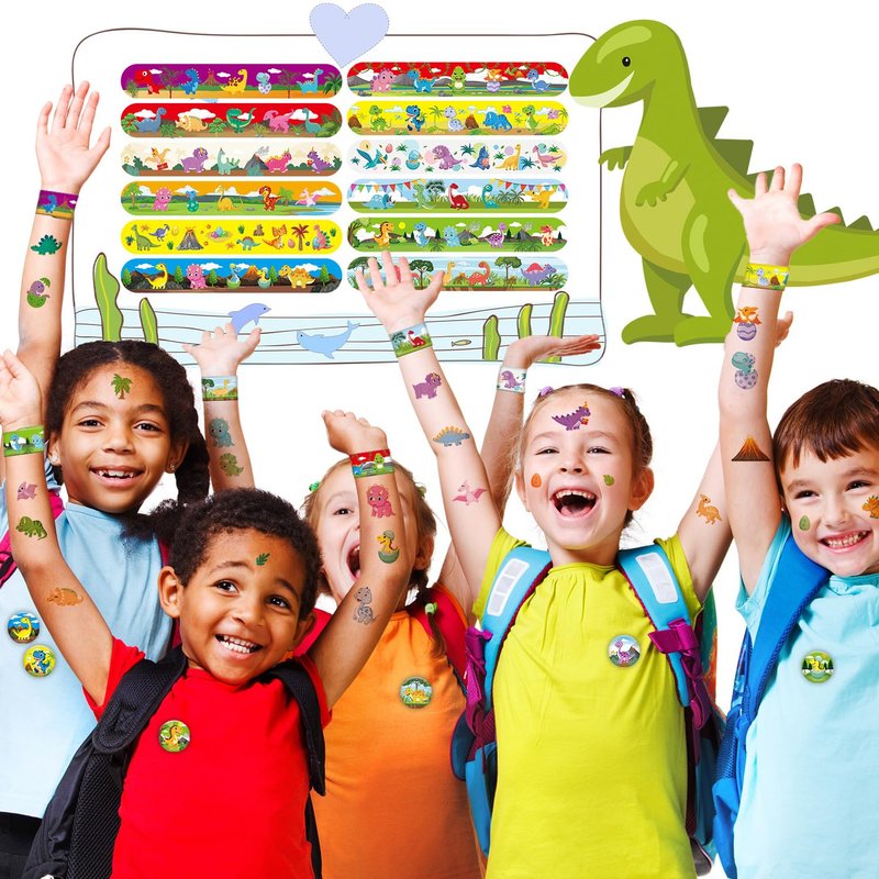 - Reliable Material: The dinosaur theme goody bags, dinosaur animal stickers, and dinosaur mini notepad are made of heavy recyclable paper cards. the dinosaur button badges are made of alloy, and dinosaur slap bracelets are mainly made of durable metal cores on the inside & tightly wrapped with soft material on the outside.