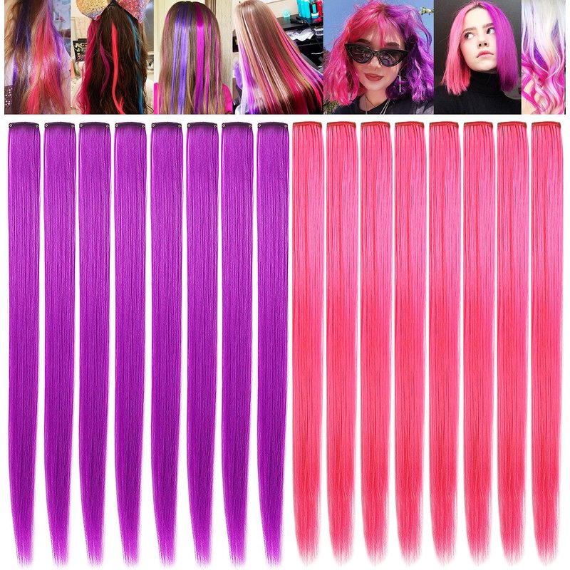 LSKJMO Pink and Purple Wig Pieces Colorful Party Highlights Clip in Coloured Hair Extensions Multicolors Straight Synthetic Hairpieces for Women Kids Girls