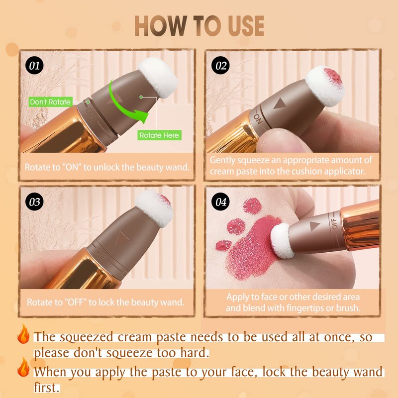 - 【How To Use】Pull out lid (do not twist it). Rotate to "ON" to unlock the makeup wand. Gently squeeze an appropriate amount of paste into the cushion applicator. Rotate to "OFF" to lock the makeup wand. Apply to face and blend with fingertips or brush. TIP: The squeezed paste needs to be used all at once, so please don't squeeze too hard. When you apply the paste to your face, lock the makeup wand first.