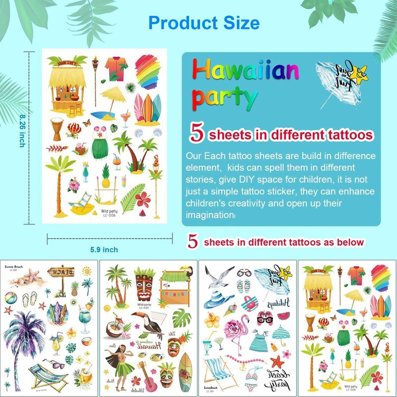 - 【5 Sheets Hawaiian Theme Tattoos】8.27inch * 5.9inch 5 sheets, totally more than 120pcs designs tropical hawaiian temporary tattoos. Every tattoo is different!