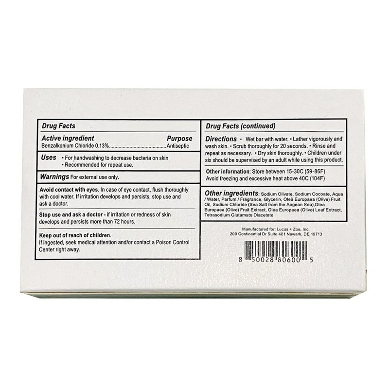 From the ancient land of Greece comes lucas + zoe soap. A triple milled soap bar made with natural ingredients such as Mediterranean Olive Oil, Coconut Oil, and Aegean Sea Salt that help to moisturize and are known to have antioxidant benefits. For all skin types, sensitivities, and uses; our hand, face, and body soap bars are designed to help fight acne, skin abrasions and other skin conditions. Using most of the olive tree in our manufacturing process, we are able to derive all the benefits from the different parts of the tree. The olive leaf is rich in oleuropein which has antioxidant properties and helps to improve skin elasticity and hydrate the skin. The olive oil used is rich in squalene, oleacine, and oleocanthal which help to nourish, hydrate, protect, and purify the skin without irritating it, leaving you feeling supple, firm and soft. While many bath soaps provide fresh scents and natural ingredients, few include benzalkonium chloride which has strong antiseptic properties.