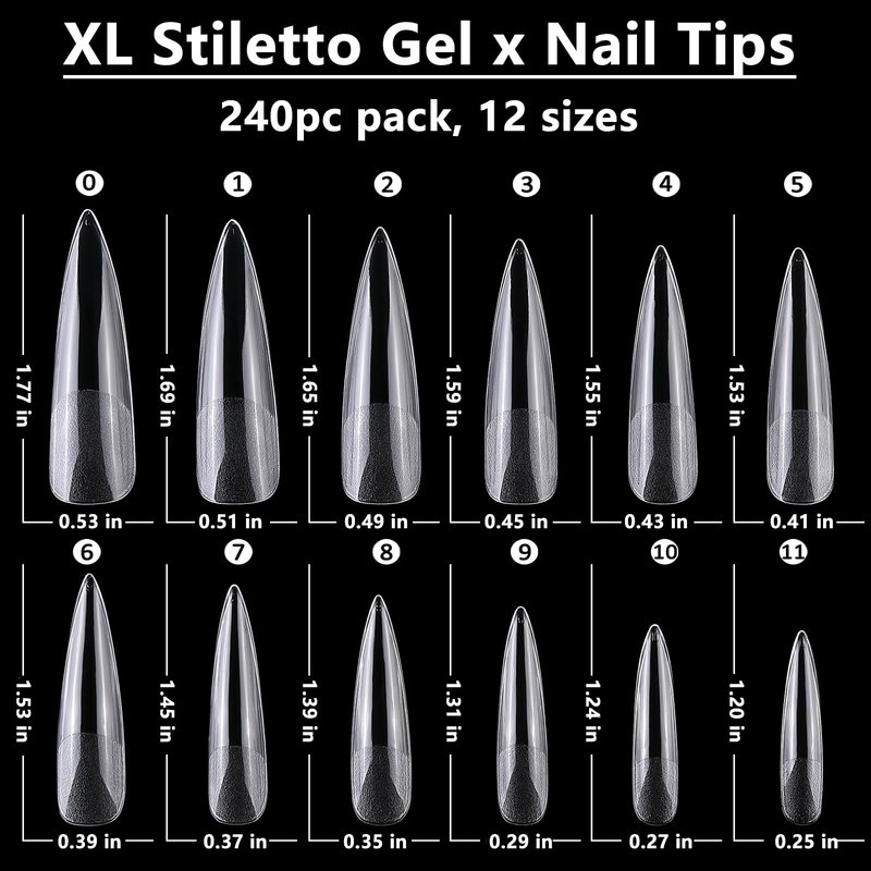 - ❤️12 Sizes XL Nail Tips for Most Fingernails: Stiletto gel nail tips featured with 12 sizes from 0-11 on tip of the nail tips. Pre-shape stiletto gel x tips are convenient to choose the most suitable size nail tips to fit your every fingers. Full size stiletto fake nail tips can fit for small/medium/large nail beds and curve/flat bed nails with their high toughness and wide range size.