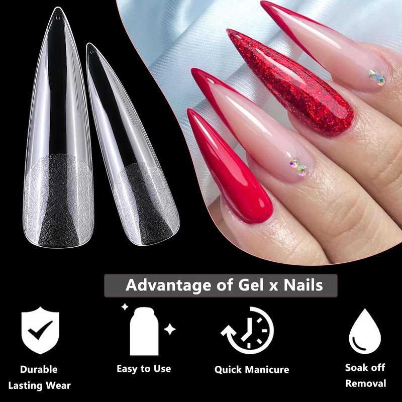 - ❤️Durable Stiletto Gel x Tips: Long stiletto gel nail tips will last for more than 2 weeks with proper care. Full cover nail tips can full coverage natural nails and look natural on fingers like real nails. Full stiletto false nails are friendly to nail beginner and manicurist. Long stiletto shape clear nail tips are easy to cut that you can adjust to different shape and length nails with nail file and nail clipper, change you nail style in ease.