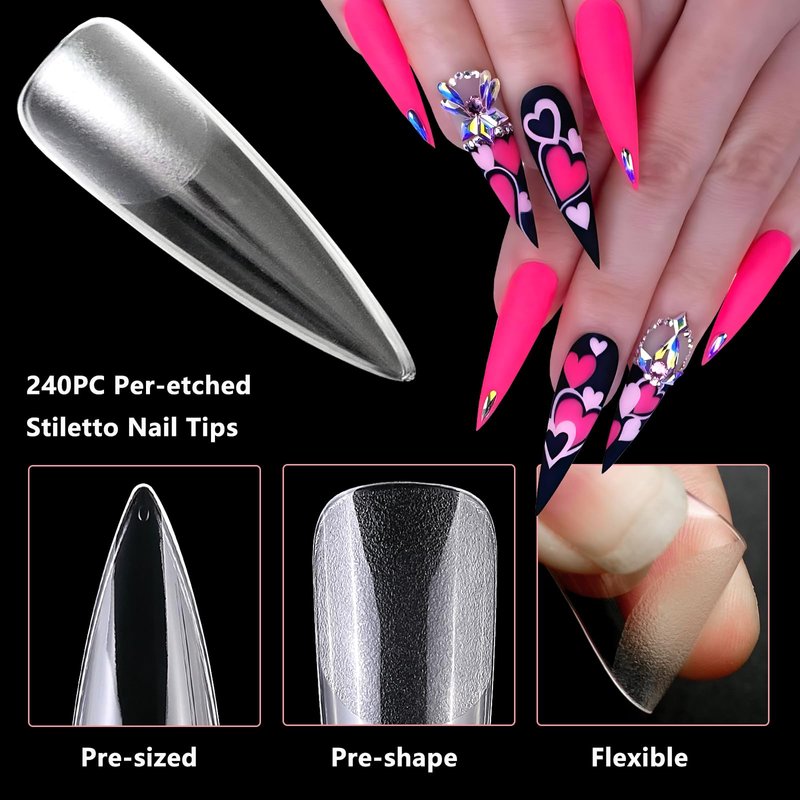 - ❤️Extra Long Stiletto Gel Nail Tips: XL gel x stiletto nail tips contains 240pc extra long stiletto shape gel x nail tips. Full cover clear soft gel nail tips stiletto fake nails are perfect for women and teenage girls have a quick are home gel x extension without go to nail salon.