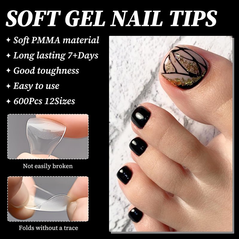 Gel x Nail Tips Quantity: 600pc acrylic nails press on toenails. Fake Toe Nails Sizes: 12 sizes gel toenails. Gel X Nails Color: Clear toenail tips. Soft Gel Nail Tips Material Type: gel x toenail tips Gel Nail Tips Style Name: french gel toe nail tips False Nails Coverage: Full cover toenail tips. Short Square Toenail Tips Form: Gel x toe tips. Toenail Tips Acrylic Target Audience: Clear press on toenails for kids, acrylic toe nails for women, girls press on toe nails clear,gel nail toe tips for teens. Clear Nails Usages: Toe gel x nails for nail extentions, toe press on nails making, toe nail art design. How to Use Gel Toe Nail Kit: uñas acrílicas toenails press ons with gel nail glue and uv nail lamp, and then apply gel nail polish, nail decorations with nail charms for nail art design. Flawless Toe Gel Tip Extensions: full cover toe nail tips without any trace, not affect daily life. Easy Application Toe Gel x Nails Tips: Gel nail extensions toe tips are suitable for nail beginners. Acrylic Toe Nail Tips Multiple Use: False toe nails gel x tips perfect for any occasion. Soft Gel Tips Professional Results: Press on nail tips full cover easily get salon perfect press on nails. Full Coverage Toenail Tips with Endless Possible: With gel x toenails tips mix and match with nail charms for different nail art design. Fake Nails Clear Seamless Blending: Whether you prefer natural nail tips or gel extensions, toe gel nail tips kit seamlessly blend with your natural nail bed. Strong Full Cover French Toe Nail Tips: Clear Press on toe nail tips are incredibly strong and resilient, gel toe nail tips for acrylic nails offering long-lasting wear without sacrificing style. Perfect Foundation with French Toe Gel x Nails Tips: Clear acrylic toe nails can provide the perfect foundation for your toe nail art decoration. Enhance Fingernails with gel x pedicure tips With toe nail extension tips, say bye to weak, brittle toenails. Clear fake toenail tips crafted with advanced Gel X technology, our toenails tips gel x are designed to withstand the rigors of daily wear. Say goodbye to chipping, lifting, and dullness – with Gel X Toenails, your pedicure stays flawless for weeks on end. Express your unique style with a wide range of colors, finishes, and designs to choose from. Whether you prefer classic neutrals, vibrant hues, or intricate patterns, there's a perfect option to suit your personal taste and complement your pedicure. Achieve salon-worthy pedicures without the hassle of salon visits. Our Gel X Toenails are designed for easy application at home, saving you time and money. Simply adhere the toenails to your natural nails using our clear instructions and enjoy instant glamour at your fingertips. Despite their durability, our Gel X Toenails provide a comfortable wearing experience. Crafted from flexible gel material, they conform to the shape of your natural nails, providing a snug and natural fit that feels comfortable throughout the day.