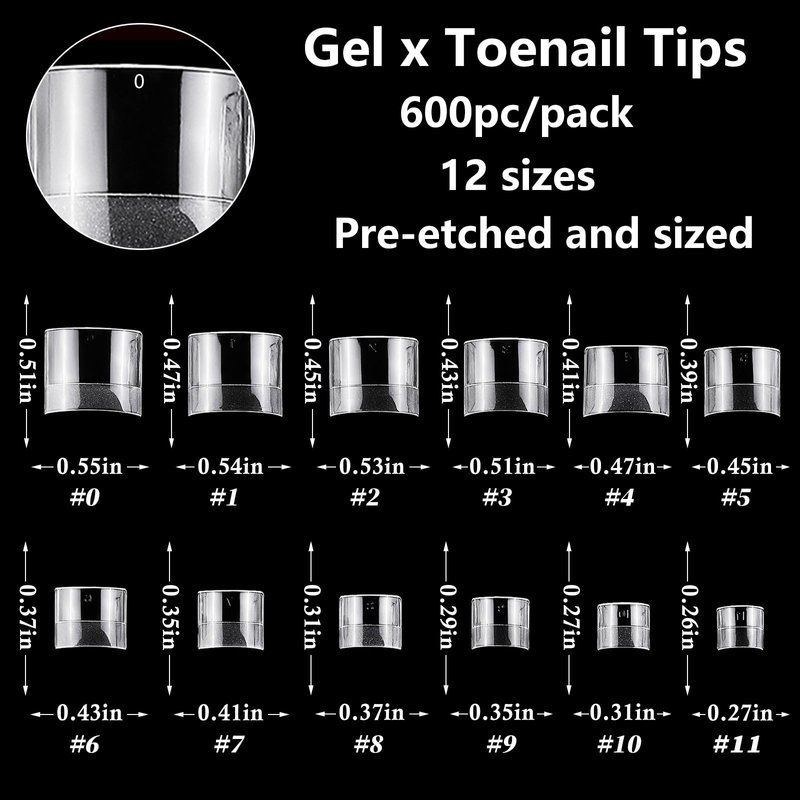 - ❤️Large Amount Clear Gel Nail Tip for Toes: Short square french fake toenail gel x tips come with 600pc french tips half cover square shaped soft gel false toe nail tips in bright color color, simi-matte pre-shape toenail tips for acrylic toe nails designed in 12 sizes, 50pc french toe nails per size, total 600pc gel x french toenail tips. Large amount clear press on toe nails square toenails french nail tips for you to make toenails press on nails, practice nail skill, build gel x toenail.