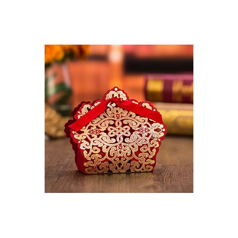 - 50 pcs red and gold lace hollow candy boxes + 50 pcs stain ribbons.