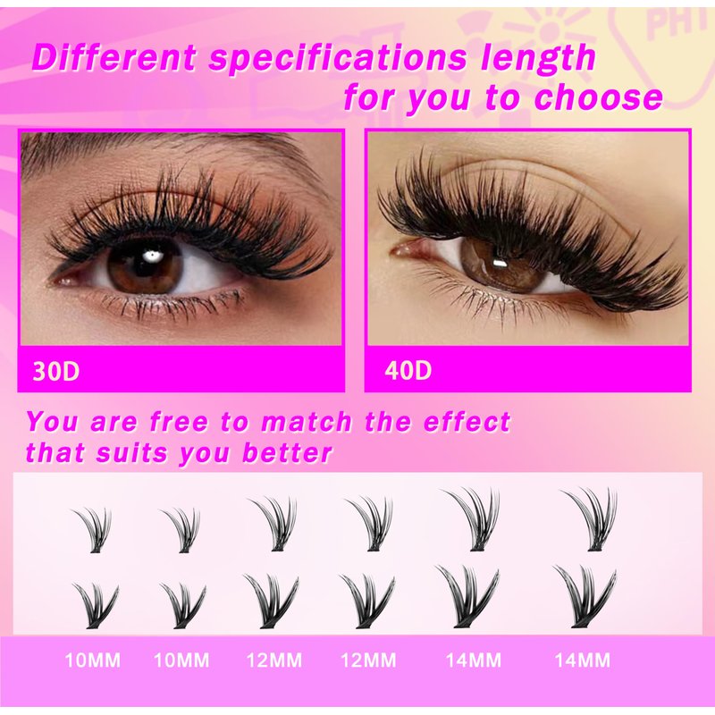 - Different styles and lengths: Our individual lashes kit includes 30D, 40D clusters, with eyelash lengths of 10mm, 12mm, and 14mm for better customization of your eyelash look, catering to your needs.