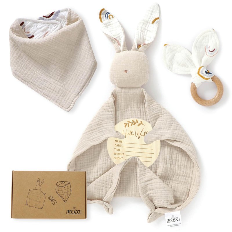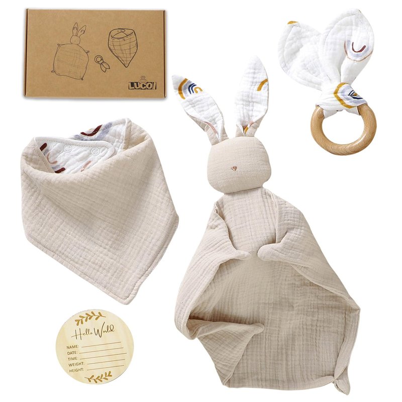 LUCOI Organic Cotton Baby Gift Set - 4-Piece Muslin Bunny Lovey Security Blanket, Teether Ring, Bandana Bib & Wooden Announcement Card - Gender Neutral Newborn Gifts, Welcome Baby Box, Baby Loveys