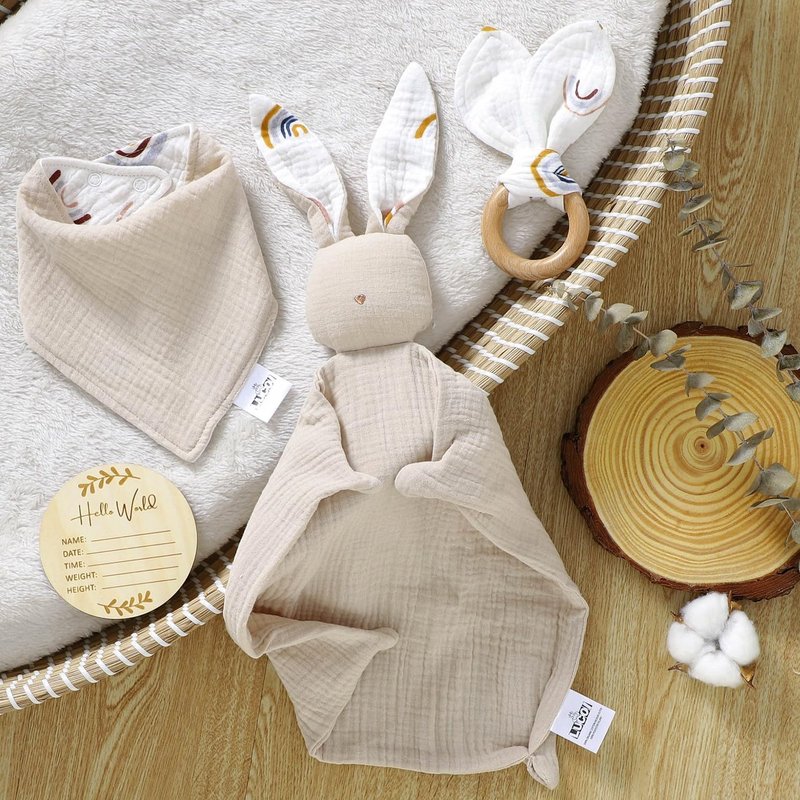 - Perfect 4-Piece Newborn Gift Box: Gender-neutral baby gift set with 12 x 12-inch muslin bunny lovey, adjustable double-sided unisex bib, bunny ears teething ring, and 'Loveys for Babies' milestone card; perfect as organic cotton baby toys for girls and boys
