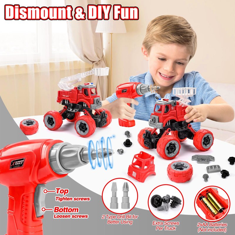 - DISMOUNT DIY FUN: Firetruck toys 3-5 years old with electric drill and hand drill. 2 buttons on electric drill(2xAA BATTERIES NEED, NOT INCLUDED), easy to get truck screws through or loosen by your kids. Hand drill fits well for small hands, righty tighty, lefty loosie. Tons of fun 3 4 5 year old boy toys, build your own car toys for boys 3-5!