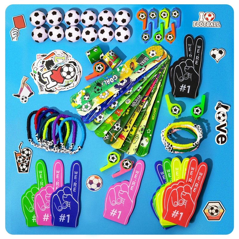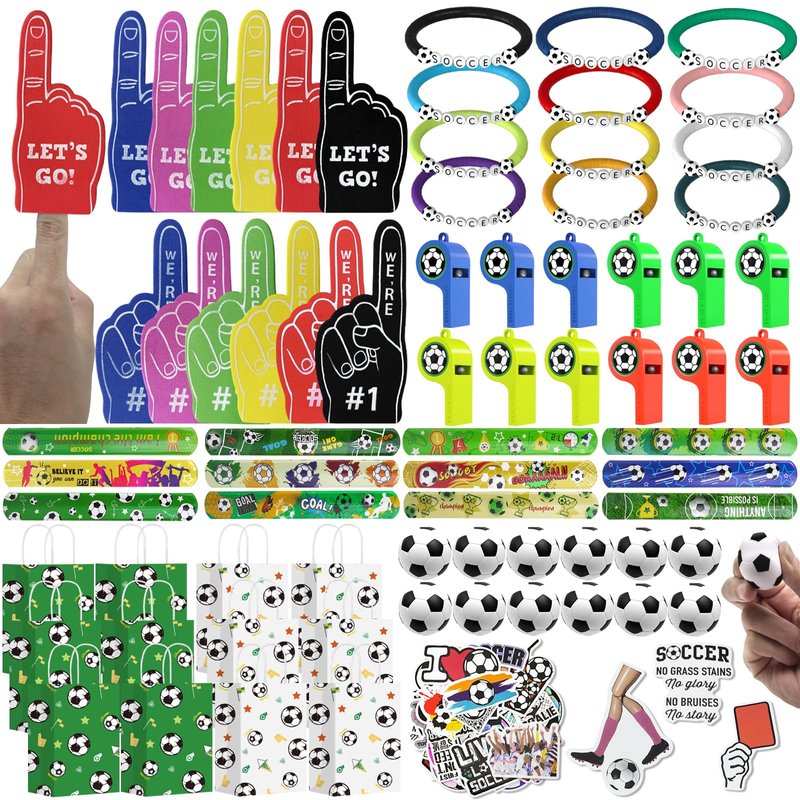 - You Will Receive 122 pcs Soccer Party Favors Set : including 7 different items: 12pcs silicone bracelet ,50 pcs soccer sticker ,12pcs soccer slap bracelet , 12pcs mini foam soccer, 12 pcs mini foam fingers, 12 football style whistles, 12pcs soccer gift bags
