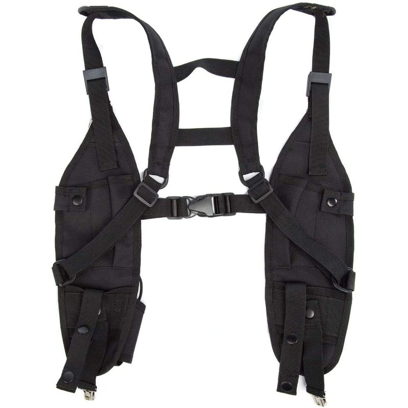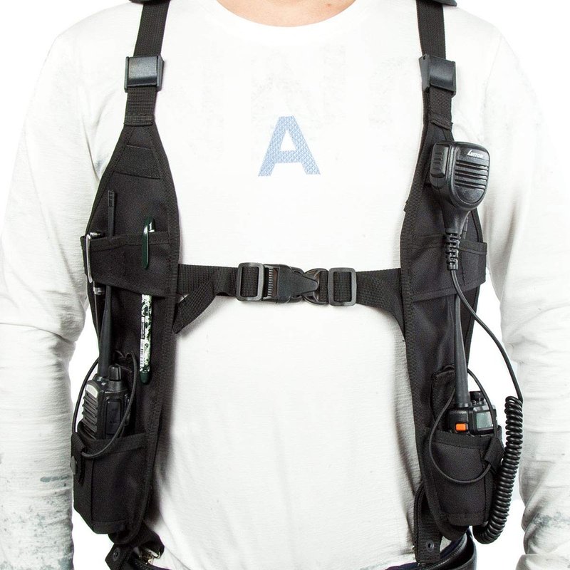 - Fully Adjustable for Maximum comfort, all portable radio size, Men/Women. - Antenna keeper eliminates bulging under garment. - Velcro lapel Mic cord Keeper - Can be worn inside or outside jackets or vests and maintain comfort. - Four rear pouches for pens, flashlight, knife or other use. - Holds two radios or can be converted to hold cell phone. - Low Profile, ideal for covert & undercover - Seat belt friendly will not hinder or tangle - The unique suspension system virtually made your harness will not bounce or swing. - Simple design for easy operation. - Ideal for radios and small hardware - Great for mounted and dismounted environments where having a radio, GPS, knife.