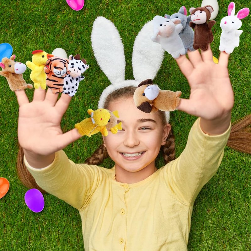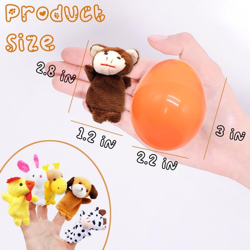 - Super Value Set: Our finger puppet set includes 20pcs animal soft plush finger puppets in 10 designs, 20pcs plastic easter eggs in 5 colors. The finger puppets are about 2.8*1.2inch, suitable for kids’ and adults’ fingers.