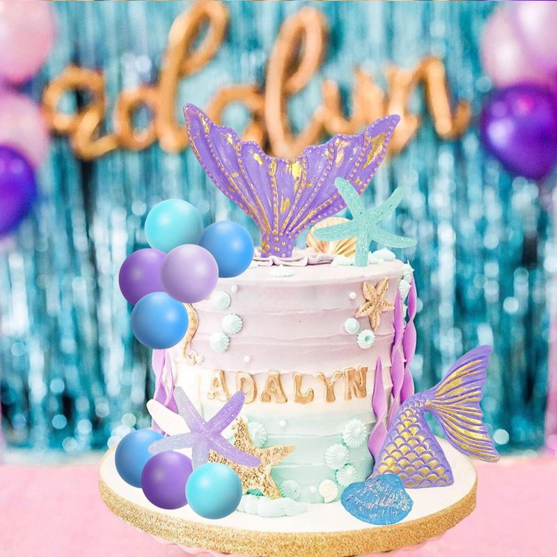 - 【Mermaid Tail Cake Decoration】26Pcs Decoration mermaid tail toppers include 2pcs mermaid tails,2pcs sea stars,2pcs seashells,5pcs dark purple balls,5pcs light purple balls,5pcs dark blue balls,5pcs blue balls,various styles can satisfy your multiple cake decoration needs.(Size as shown in the picture.)Our mermaid theme cake decoration will bring dreamy and beautiful embellishment to your party.