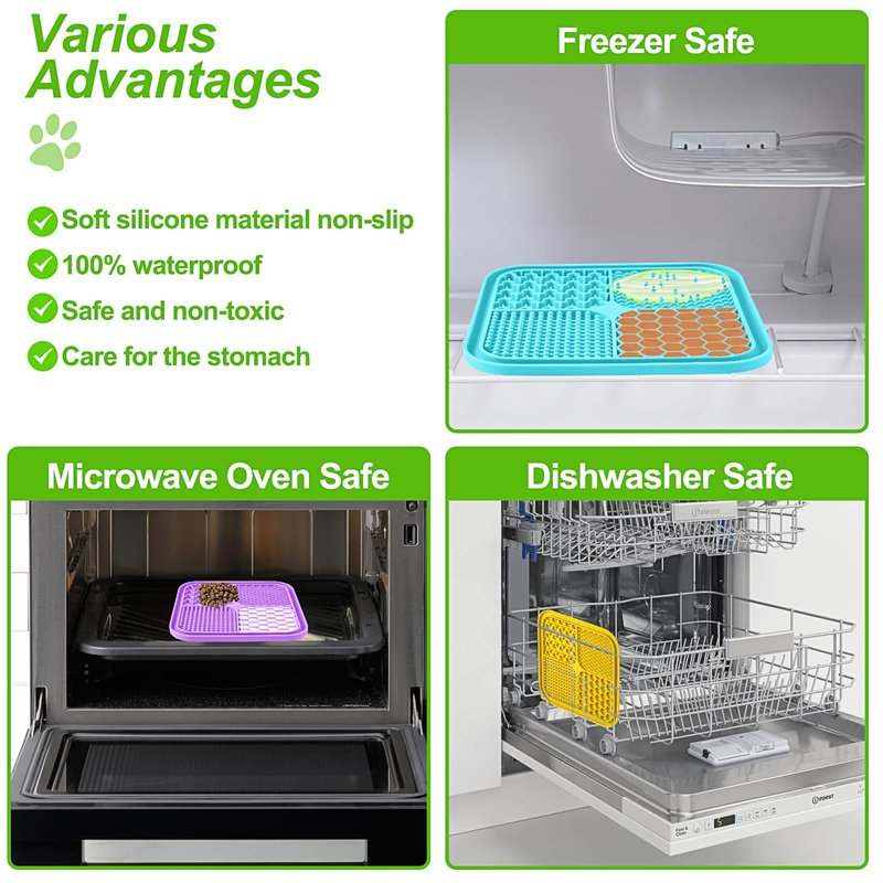 - ❤️🐶🐱【Slow Feeder Mat for Dogs & Cats】: Four different textured surfaces design is prefect for spreadable treats, such as cream cheese, yoghurt, peanut butter and so on. It is a peanut butter mat for dogs to extend the feeding time and aid digestion. This feeding mat is an ideal size for cats, puppies, small meduim and large dogs.