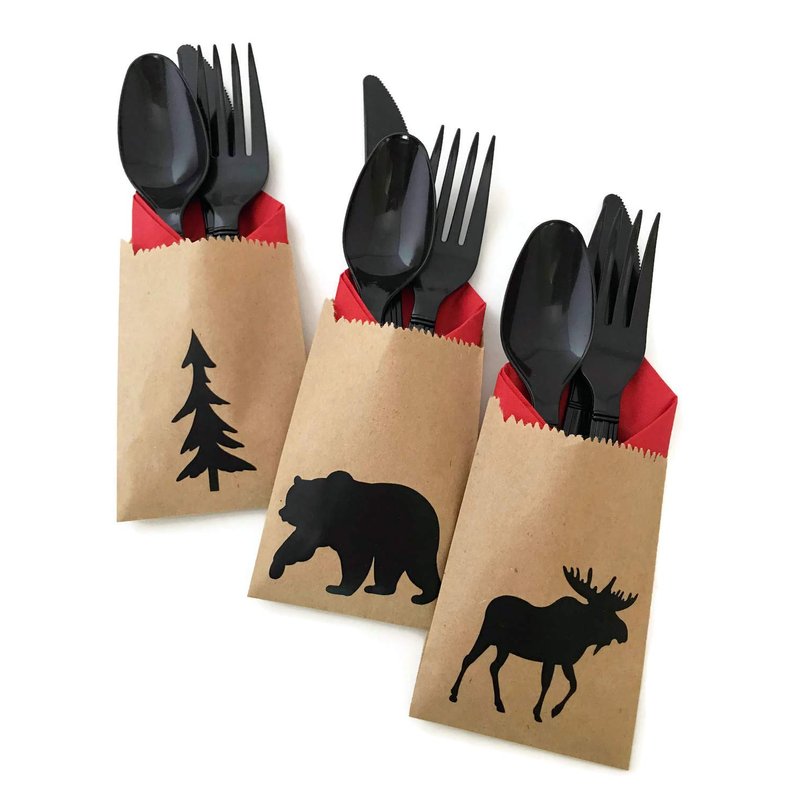 Serve food and dessert to your lumberjack, woodland or camping party guests in style! This set includes: 24 kraft paper bags (4" x 2.5") with black handmade vinyl decals that alternate between a tree, bear, and moose; 24 red beverage-size (5" x 5") 3-ply paper napkins; 24 black plastic knives; 24 black plastic forks; and 24 black plastic spoons. Simple assembly required: wrap silverware inside napkins, tuck inside bags, enjoy! Handmade in Oregon, USA.